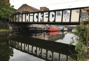 The last leg of the walk follows the Hackney Cut and our surroundings change again.  As we pass along the edge of the Queen Elizabeth Olympic Park to conclude our walk at Hackney Wick we are right back in urban east London with cafes, improvised art installations, graffiti and a few vestigial remains of local industry.
